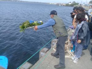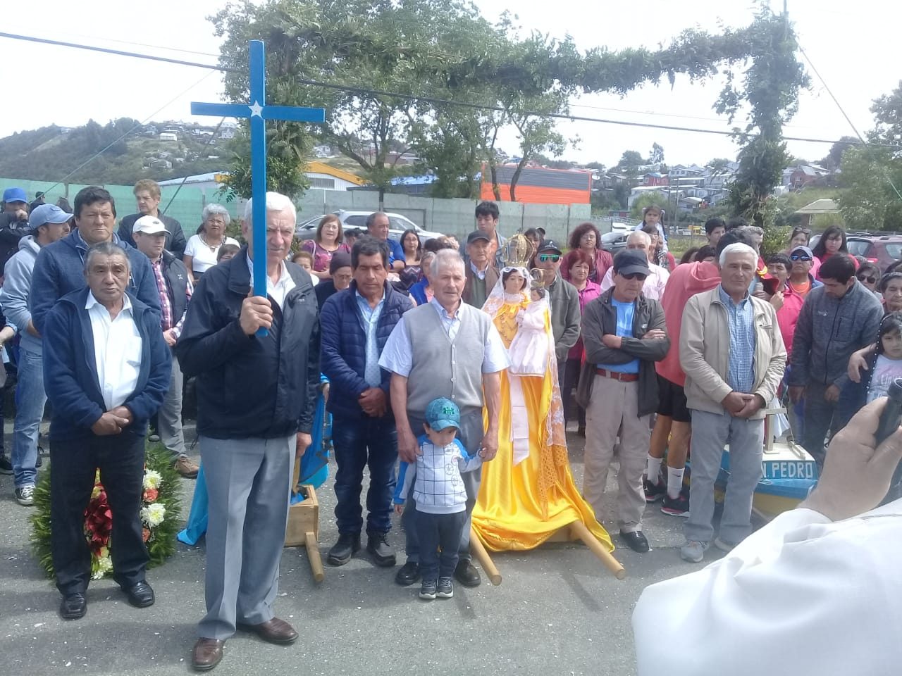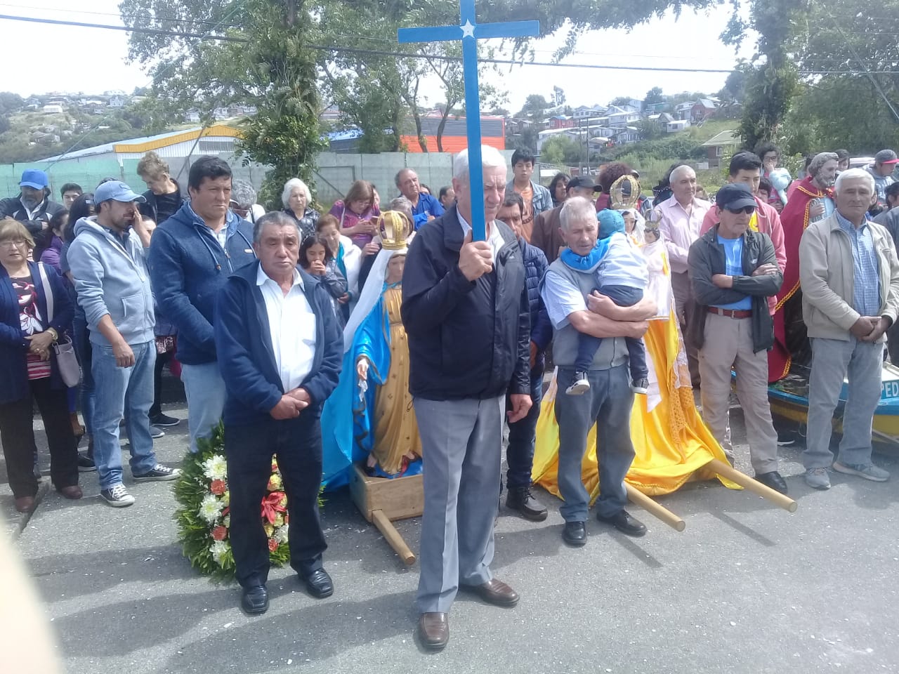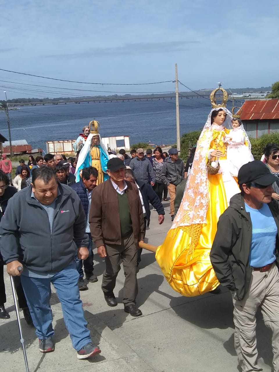 Comenzando con la procesión desde la Capilla hacia el muelle de Pudeto, para entregar sus ofrendas de flores, recordando y rezando por los pescadores que han perdido la vida en el mar, y también orando por el trabajo que nunca falte, el Padre Obispo dio una bendición especial, además se bailó a la Virgen unos pies de cuecas. De regreso a la Capilla, peregrinando, orando, cantando y acompañados de los pasacalles, se realizó la Eucaristía, presidida por Mons. Agurto.