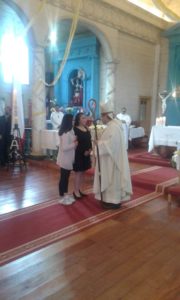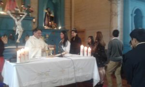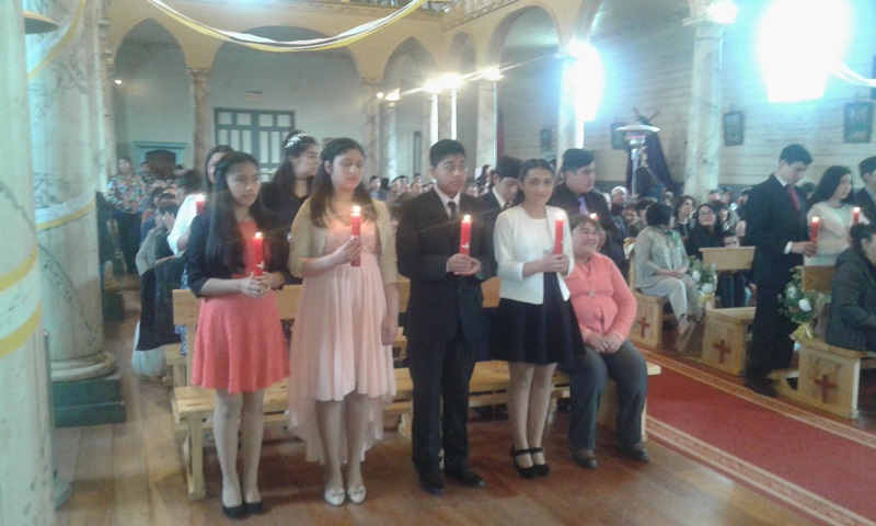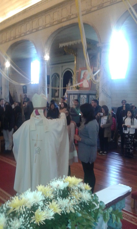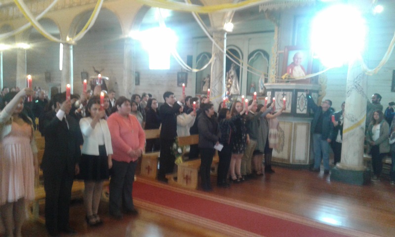 Los confirmandos de las comunidades de Nercón y San Pedro, acompañados por sus respectivas catequistas, padres y padrinos junto al párroco P. Edito Rain, renovaron sus promesas bautismales, para después abrir sus corazones para recibir en plenitud el Espíritu Santo, acto seguido el Obispo selló con oleo a los jóvenes.