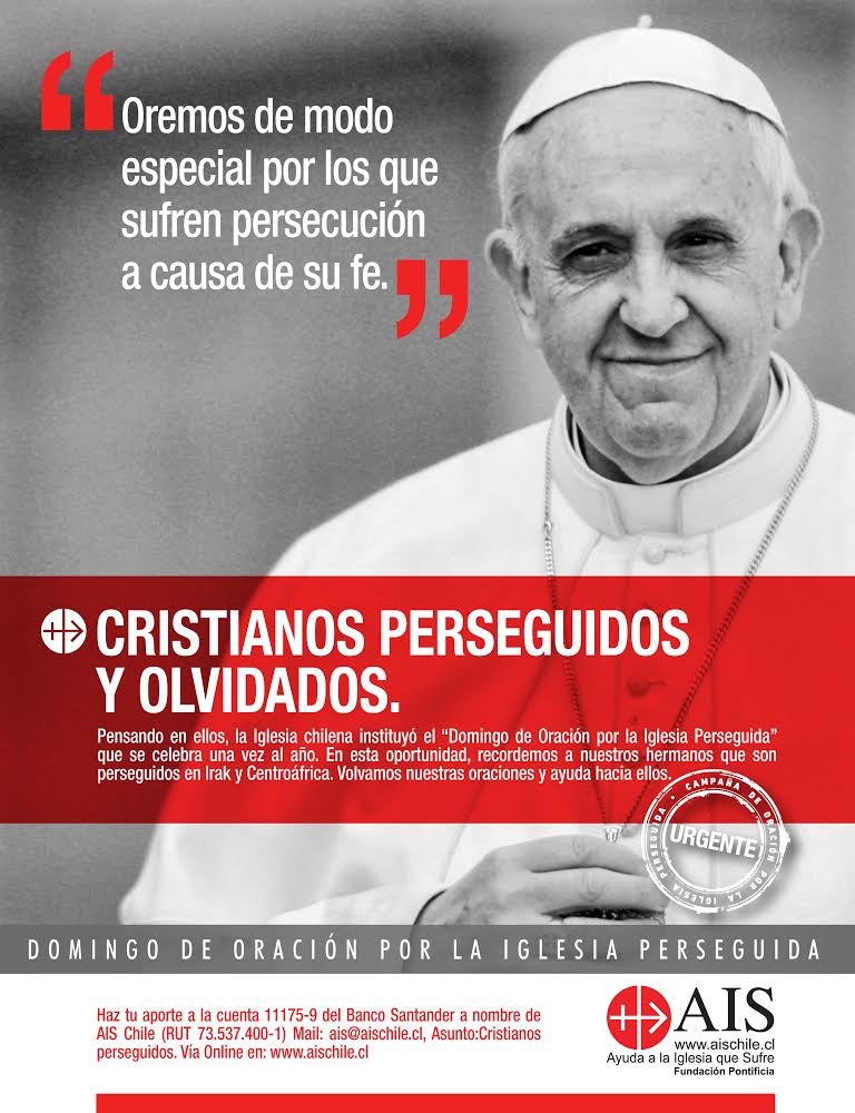 La fundación pontificia Ayuda a la Iglesia que Sufre (AIS) ha preparado material especial para informar y motivar a las personas a rezar por esta causa. Lo puedes descargar en aischile.cl. Pensando los perseguidos por su fe, la Iglesia chilena instituyó el “Domingo de Oración por la Iglesia Perseguida” que se celebra una vez al año. Te invitamos a recordar en forma especial este “Domingo de Oración”, a nuestros hermanos que son perseguidos y humillados por su fe en Irak y la República Centroafricana.