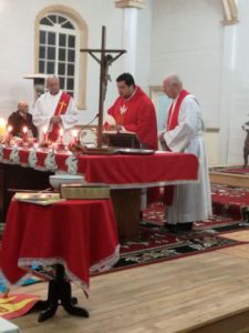 Luego se dio inicio a la Eucaristía que fue presidida por el Párroco el P. Alex Gallardo, concelebrado por el P. Andrés de Beer, acompañados por su diácono. El Padre Alex, quien también animó con la guitarra, expresó que “fue un momento grato de compartir con una buena participación de los fieles, donde realmente sentíamos la presencia del Espíritu Santo en nuestros corazones”. Durante la misa cada comunidad presentó en procesión hacía el altar un signo que representaba cada uno de los siete dones del Espíritu Santo.
