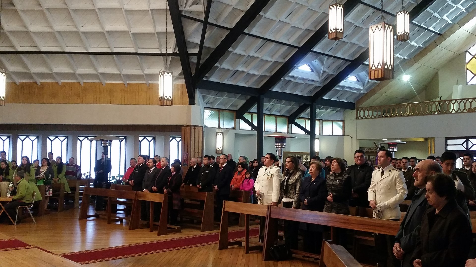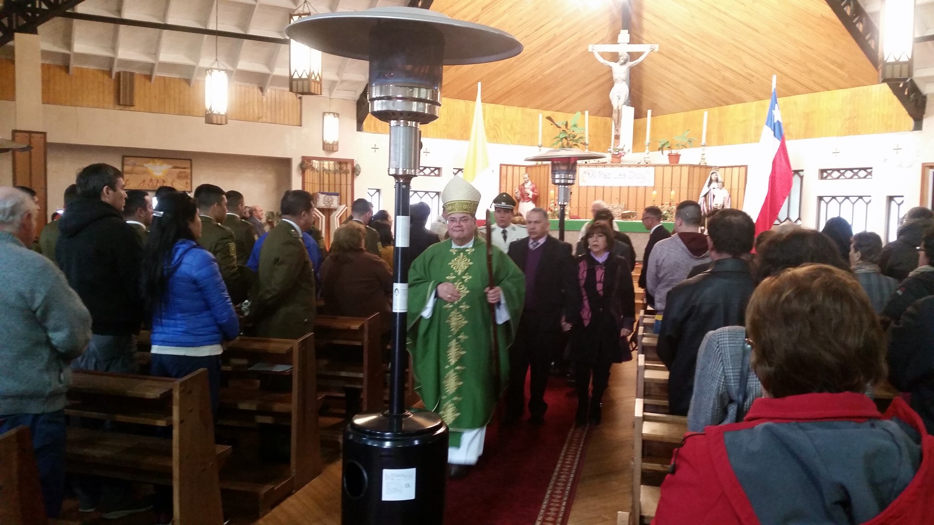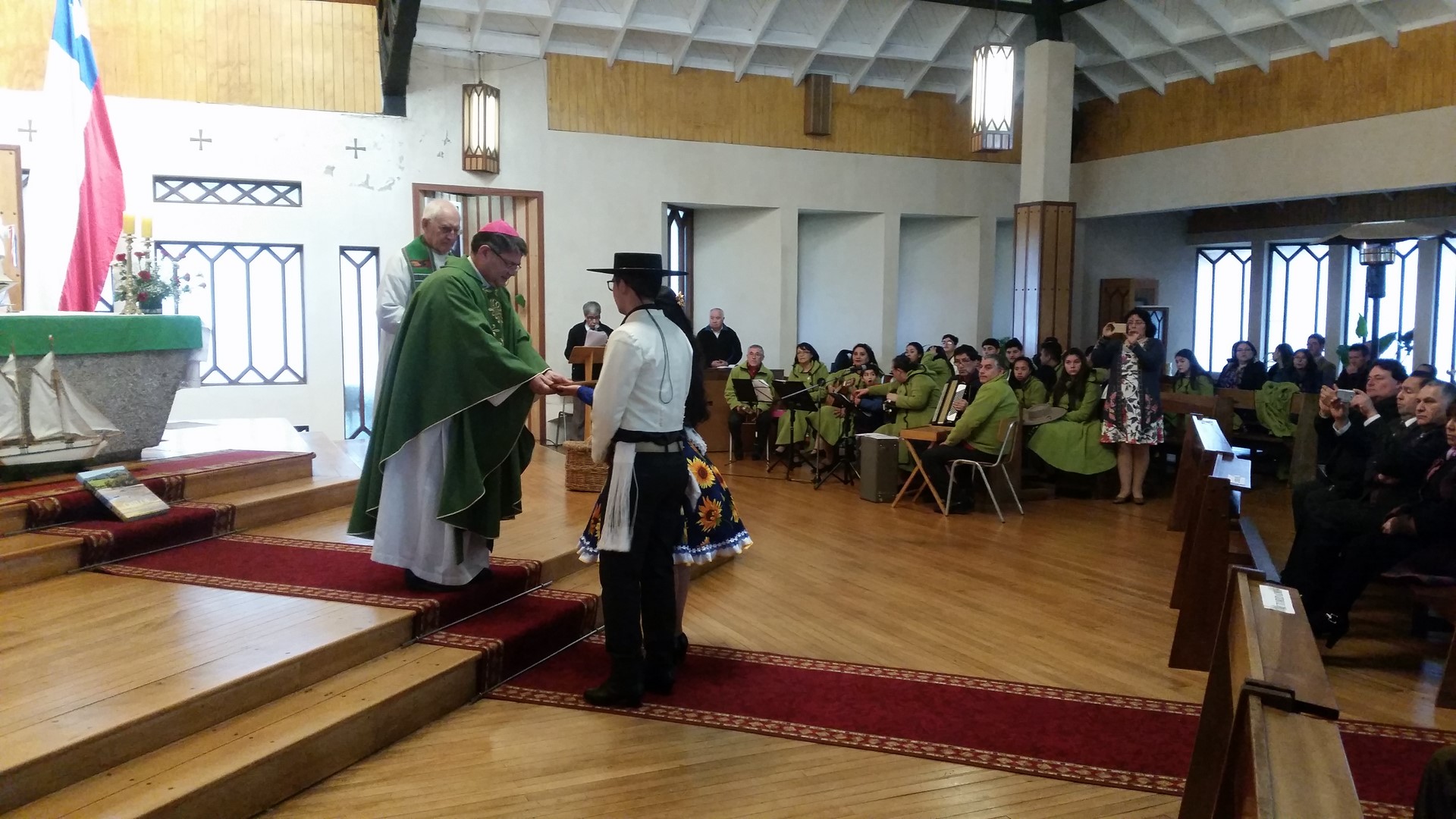 Con la Iglesia repleta de fieles, autoridades comunales juntamente con el Obispo Diocesano, el pasado domingo 17 de Septiembre se realizó en la Catedral de Ancud la solemne eucaristía de fiestas patrias. La Misa que fue presidida por Mons. Juan María Agurto, y concelebrada por el Padre Amado Garay y el Padre Hernán Leimraich, la cual se destaca por ser un “canto de alabanza a Dios, Te Deum”, estuvo animada por el conjunto folclórico Tierra y Esperanza de Ancud y donde estuvieron presentes el alcalde Carlos Gomez, algunos concejales, Carabineros de Chile, representantes del Cuerpo de Bomberos y otras instituciones civiles.