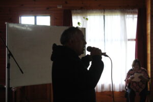 Después de cantos y danzas se dio paso al siguiente expositor quien fue Pablo Choloux, un cantautor de la región del Bio-Bio, quien en palabras muy humanas y acompañado de cantos brindo a los presentes un tema que con interrogantes hizo a los asistentes reafirmar su Fe y su vocación al servicio siendo catequistas, dejando claro que cada uno de ellos no estaba allí por casualidad, si no que por voluntad divina. Además, con canto logro tocar el corazón de los laicos que emocionados coreaban las canciones de este cantautor Católico Chileno.