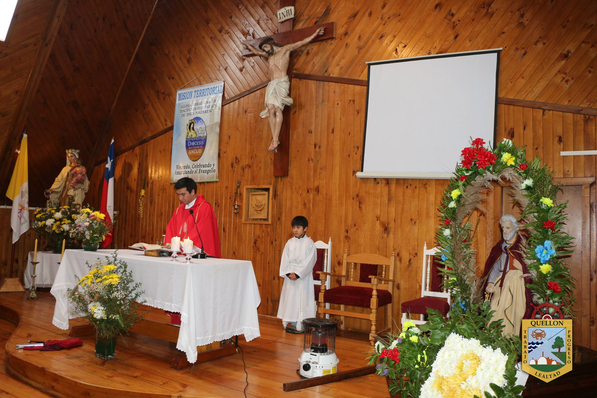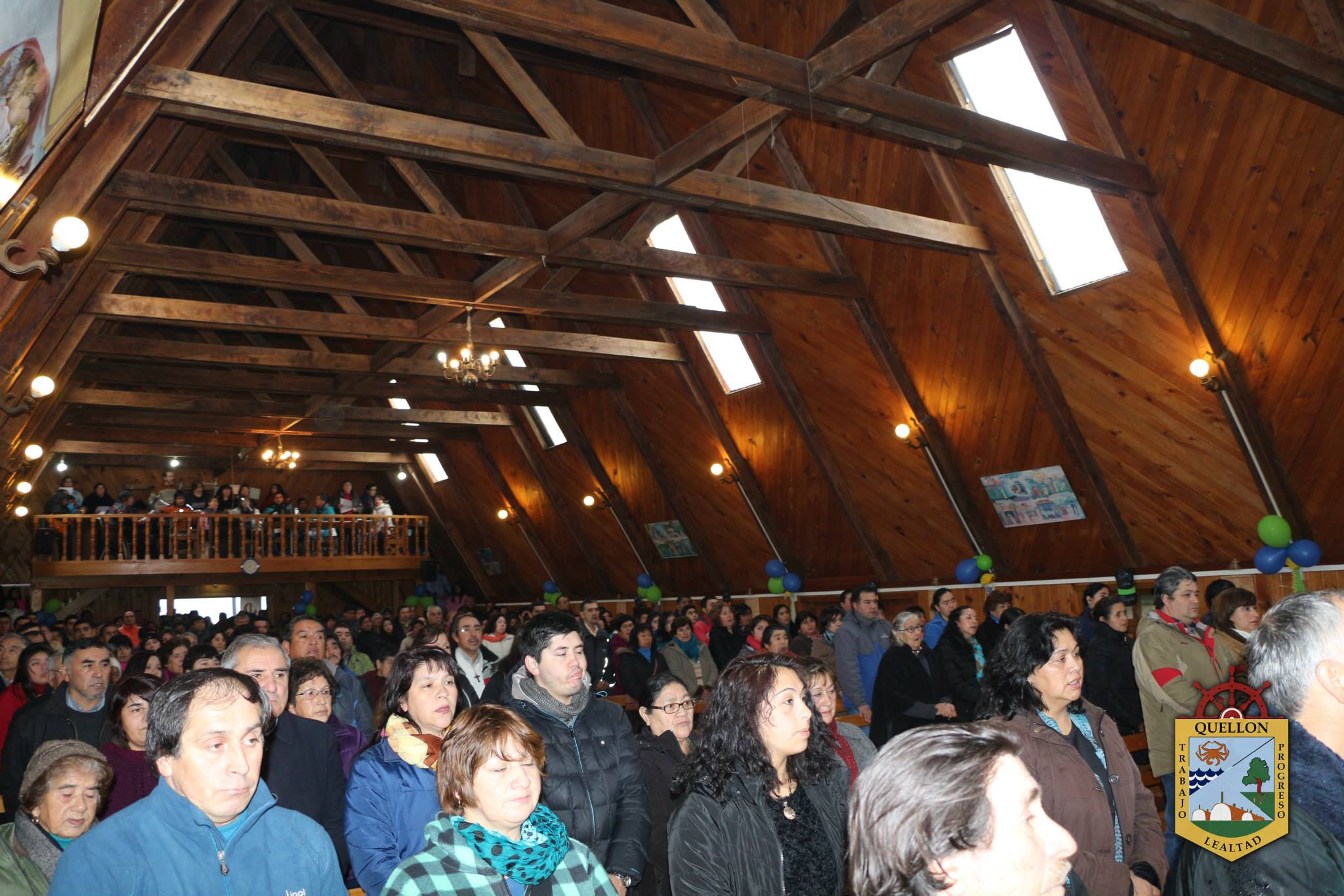 La celebración Eucarística empezó a las 11:00 horas y fue presidida por el Párroco el Padre  Carlos Cárdenas Velásquez, al oficio religioso asistió también el Alcalde de la Comuna Cristian Ojeda Chiguay y el Capitán de Puerto de Quellón Mario Besoain Fuentes, quien participo el acto con todos sus oficiales de Marina.