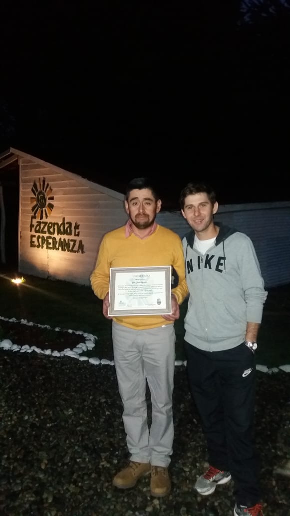 “Todo esto partió el 11 de Mayo de 2018 y hoy gracias a Dios puedo finalizar una etapa, pude completar algo, que hacía mucho tiempo no completaba cosas y eso es algo que estoy completando una vez en mi vida; fue un proceso que tuvo altos y bajos, tuve algunas complicaciones, pero el proceso en la fazenda es así, hay momentos buenos y malos sino no sería una caminata completa; hoy puedo decir que soy un hombre nuevo, aunque tenga que seguir trabajando muchas cosas, pero lo más importante que ya gané una batalla de esta guerra, y una batalla muy importante, que me va servir, y sin duda que dentro de ese proceso también hubieron momentos que quise tirar la esponja, que quise tomar mi bolso e irme, pero algo me retuvo aquí, y fue Jesús, quien fue mi escudo, mi protección; estoy contento, agradecido de Dios primero que nada, y de esta fazenda; yo creo que la fazenda es un lugar donde uno puede encontrarse con ese Cristo Resucitado, con ese Jesús que nos salva, que nos busca y nos da nueva vida, y eso encontré yo aquí; quiero que esto también sirva de ejemplo, aquí en Chiloé sobretodo, yo soy el primero chilote recuperado y el segundo en la primera fazenda de Chile y eso me llena de orgullo y ojalá mi testimonio sirva para otros, porque sí se puede, puedo dar fe que sí se puede recuperarse en la fazenda, no hay pastillas, no hay psicólogo, solamente la oración, la convivencia y el trabajo, que son los pilares fundamentales de este proceso. Estoy contento, feliz y muy agradecido”. José Eliseu Oyarzún, 38 años.