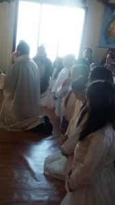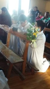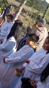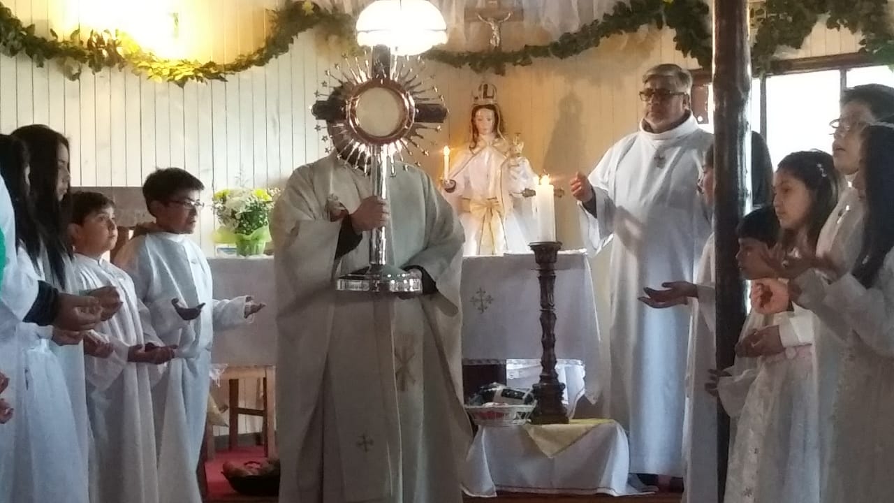 En la Capilla San Pedro, el altar fue preparado y adornado por el grupo de confirmación de primer año. A su vez los niños de primer año de la catequesis familiar acompañaron la procesión en Nahuiltad, todos con sus túnicas blancas, recibieron a Nuestro Señor con pétalos de flores. Además en la Capilla de Nahuiltad, con mucho cariño la comunidad preparó un rico compartir fraterno una vez finalizada la celebración Eucarística. Ambas celebraciones fueron presididas por el párroco P. Edito Rain.