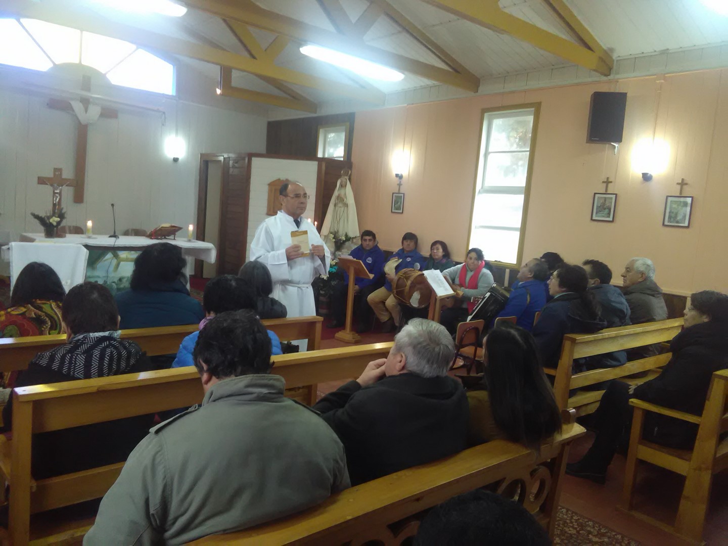 En seguida se dio continuidad a la santa misa en la cual los pescadores de la caleta de Fátima, llegaron con sus familias, trayendo la imagen de San Pedro para ser bendecida, y que contó con la presencia de un grupo folclórico del hospital de Ancud, finalizando con un compartir que con cariño fue preparado por las familias de los pescadores. Don Nestor Cárdenas quien fuera pescador y hoy tiene un puesto de ventas de pescados y mariscos, dejó su testimonio, manifestando que antes de salir a la pesca se encomendaba y le pedía su protección a San Pedro, su patrono y hasta la fecha siempre ha sido protegido.