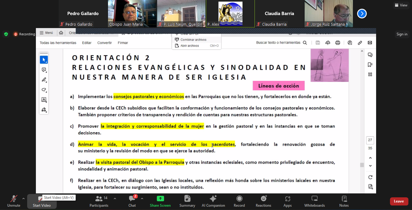 Agentes pastorales de la diócesis se reunieron en horas de la tarde de ayer por medio de la plataforma zoom para discutir las nuevas orientaciones pastorales de la iglesia en Chile. En la próxima asamblea diocesana del 25 de noviembre, se profundizará en estos temas.
