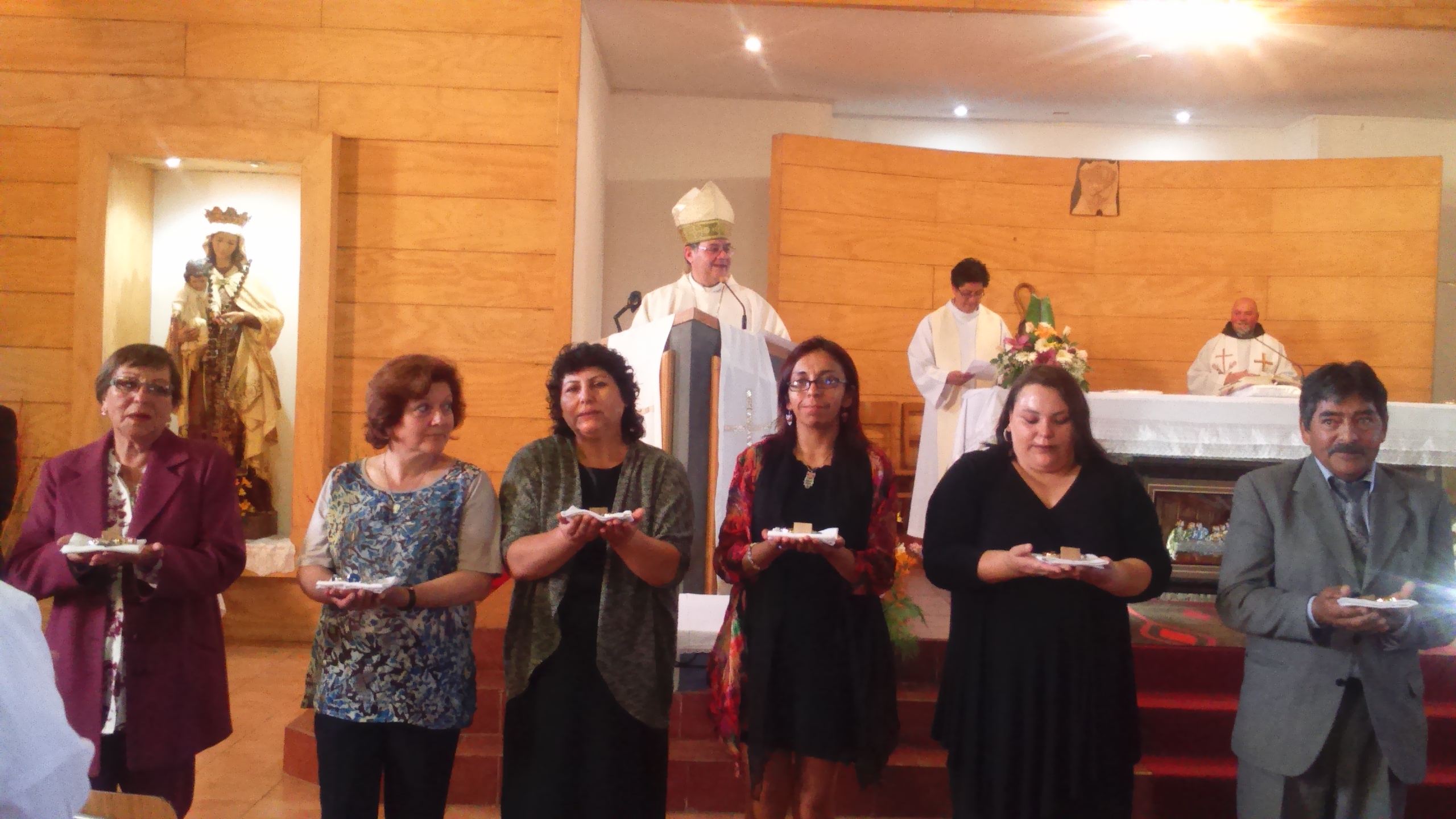 El nombramiento de los nuevos servidores ocurrió en la celebración Eucarística de este día, la cual fue presidida por el P. Obispo Juan María Agurto y concelebrada por el Párroco P. Luis Neum, también por los sacerdotes Daniel Mansilla y Fr. Pedro Cisternas. El objetivo de servicio de los ministros de comunión es llegar hasta nuestros hermanos enfermos para visitarlos y llevar a ellos a Cristo, saliendo así a las periferias como nos pide el Papa Francisco, ir donde el otro nos necesita saliendo de la comodidad del hogar, con especial ímpetu en este Año Santo de la Misericordia.