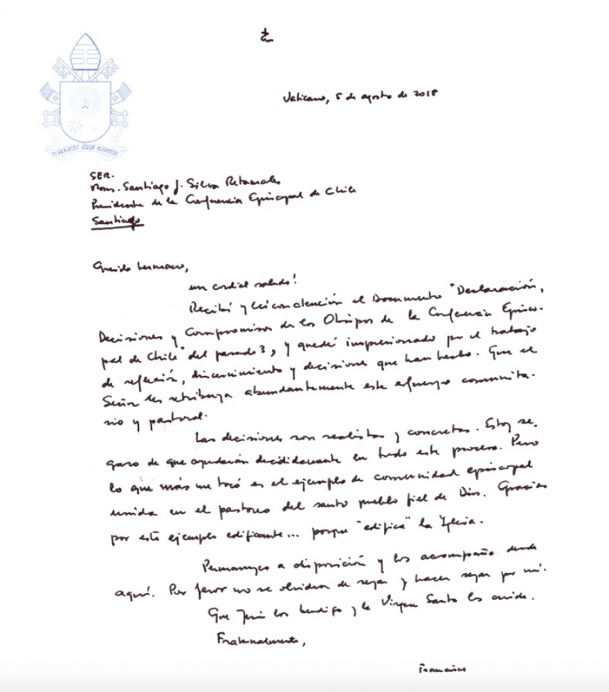 En el documento, fechado el 5 de agosto en el Vaticano, el Papa Francisco manifiesta que las decisiones de la 116ª Asamblea Plenaria Extraordinaria de la Conferencia Episcopal de Chile “son realistas y concretas. Estoy seguro que ayudarán decididamente en todo este proceso”.