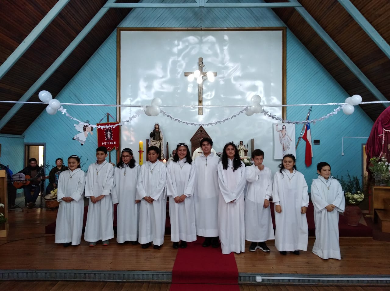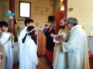 El domingo 08 fue la vez de la comunidad de Jesús de la Buena Esperanza de Putemun donde hicieron su primera comunión 10 niños acompañados por su catequista, familiares y la comunidad en general. El día sábado 14 se realizó este sacramento en la comunidad de Nuestra Señora de Lourdes de LLau-Llao donde 8 niños recibieron a Jesús eucarístico por primera vez. Luego el día sábado en vísperas del domingo del Buen Pastor se realizaron las primeras comuniones en la comunidad de San José de Pid-Pid donde 12 y niños y dos mamás que también se prepararon junto a sus hijos en la catequesis recibieron al Señor sacramentado.