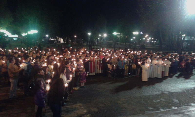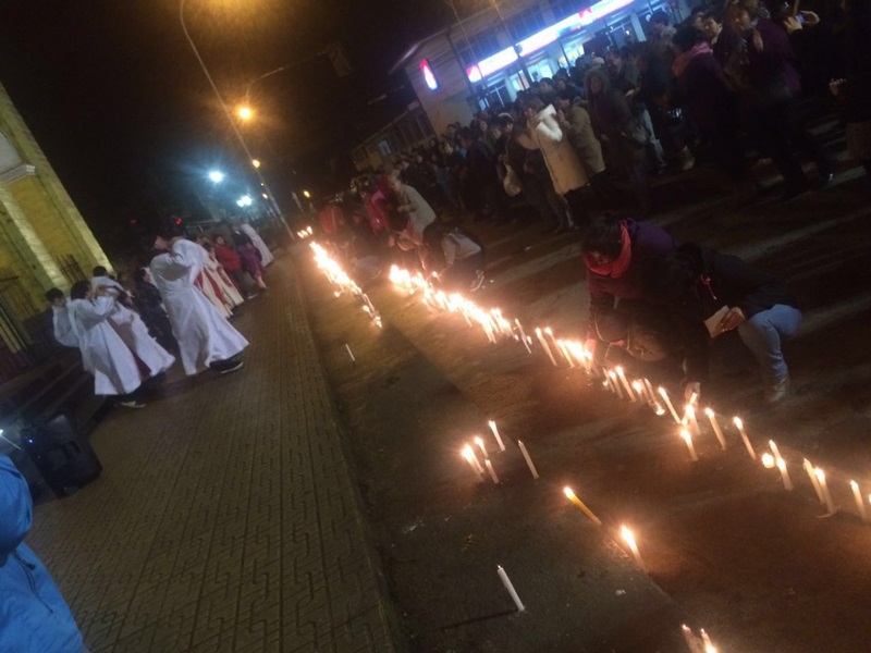 Las parroquias del Sagrado Corazón de Castro alto, San Juan Pablo II del sector de Gamboa junto a Apóstol Santiago se dieron cita en el Templo San Francisco en la víspera del domingo 15 de Mayo, para posteriormente salir al frontis de la Iglesia frente a la plaza de armas de la ciudad capital de Chiloé, alrededor de las 21:00 hrs., para cantar, bailar y alabar a Dios Padre.