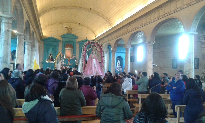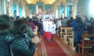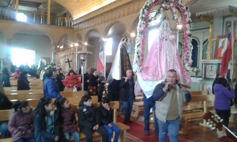 La misa fue presidida por el Párroco, Padre Edito Rain siendo acompañado por los Diáconos Francisco Mario y Fernando este último recientemente avecindado en la comunidad de Llicaldad y llegado desde la Diócesis de Santiago. En la oportunidad el Padre Edito en su prédica destacó el papel de la Virgen María como intercesora ante su Hijo Jesús, a propósito del Evangelio de san Juan que fue proclamado: “…Hagan todo lo que Él les diga…” Jn. 2,5. Al término de la Eucaristía se efectúo nuevamente una colorida peregrinación por el exterior del Templo, acompañados de cantos marianos, para dar gracias el Padre Dios por haber dado una Madre Espiritual, la que nos guía con amor a su Hijo Jesús.