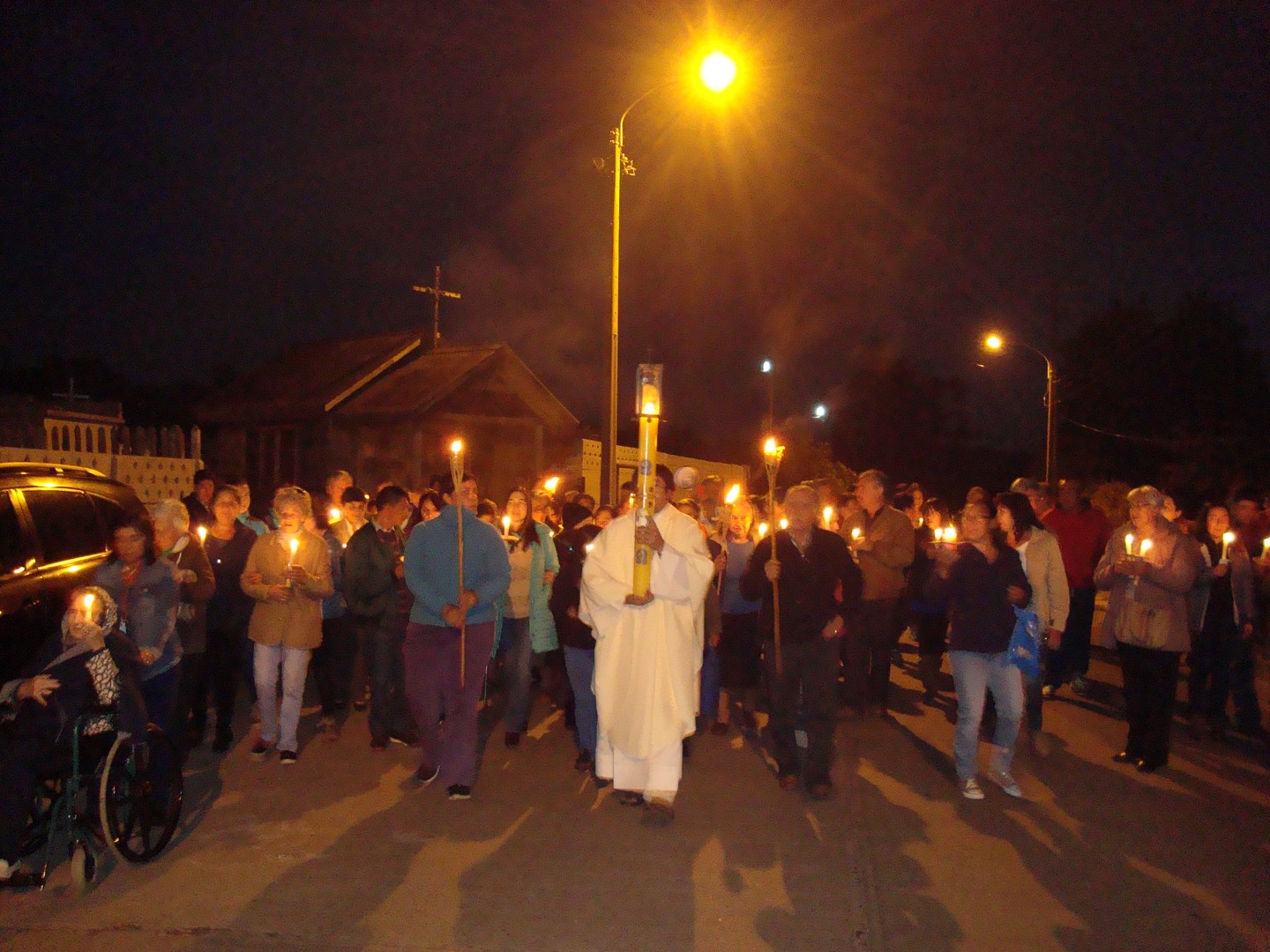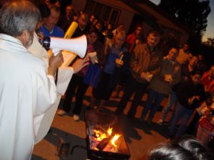 Culminando el triduo pascual, el día sábado la gran vigilia pascual, dónde empezamos a celebrar la resurrección de Nuestro Señor Jesucristo, Él que venció la muerte y nos abrió las puertas del cielo. Todo comenzó con la bendición del fuego en la entrada del cementerio del pueblo, con los peregrinos nos dirigimos en procesión con el sirio pascual encendido por las calles de la ciudad hacía el templo donde con alabanzas celebramos a Jesús resucitado. La eucaristía fue presidida por el párroco padre Arturo Mansilla, concelebrado por el Vicario padre Pedro Salgado, en una noche de alegría, alabanzas y acción de gracias por la resurrección de Jesús, Él que nos trae vida nueva y que nos ama infinitamente.