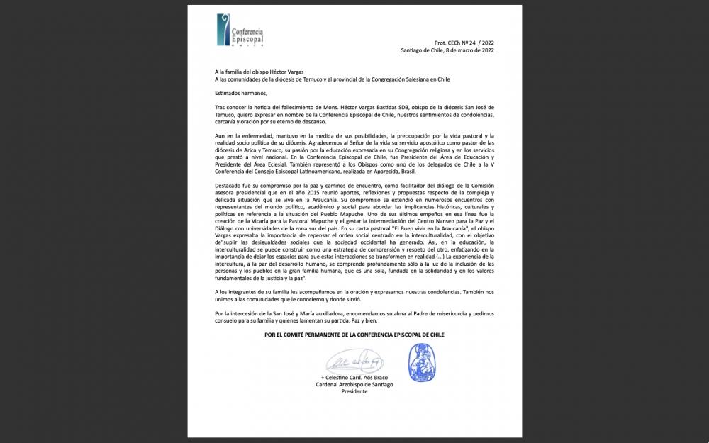 Condolencias del Episcopado por fallecimiento del obispo Héctor Vargas Bastidas El presidente de la Conferencia Episcopal de Chile hizo llegar un mensaje a la familia, a las comunidades de la diócesis de Temuco y la Congregación Salesiana, donde monseñor Vargas prestó su servicio apostólico. Tras conocerse el fallecimiento del obispo Héctor Vargas Bastidas SDB, el cardenal Arzobispo de Santiago, Celestino Aós Braco -presidente de la Conferencia Episcopal de Chile- envió una nota en nombre del Comité Permanente y el episcopado nacional, manifestado sentimientos de condolencias, cercanía y oración por su eterno de descanso. “Aun en la enfermedad, mantuvo en la medida de sus posibilidades, la preocupación por la vida pastoral y la realidad socio política de su diócesis. Agradecemos al Señor de la vida su servicio apostólico como pastor de las diócesis de Arica y Temuco, su pasión por la educación expresada en su Congregación religiosa y en los servicios que prestó a nivel nacional”, manifestó el Arzobispo Aós, recordado el aporte de Héctor Vargas como Presidente de las áreas de Educación y Eclesial de la CECh, así como su representación de los obispos de Chile en la V Conferencia del Consejo Episcopal Latinoamericano, realizada en Aparecida, Brasil. En la misiva, Celestino Aós recordó también: “Destacado fue su compromiso por la paz y caminos de encuentro, como facilitador del diálogo de la Comisión asesora presidencial que en el año 2015 reunió aportes, reflexiones y propuestas respecto de la compleja y delicada situación que se vive en la Araucanía. Su compromiso se extendió en numerosos encuentros con representantes del mundo político, académico y social para abordar las implicancias históricas, culturales y políticas en referencia a la situación del Pueblo Mapuche”, valorando la reciente creación de la Vicaría para la Pastoral Mapuche y la intermediación del obispo con el Centro Nansen para la Paz y el Diálogo, para el trabajo con universidades de la zona sur del país. El cardenal también cita parte de la carta pastoral “El Buen vivir en la Araucanía”, donde el obispo Vargas expresaba la importancia de repensar el orden social centrado en la interculturalidad, con el objetivo de “suplir las desigualdades sociales que la sociedad occidental ha generado. Así, en la educación, la interculturalidad se puede construir como una estrategia de comprensión y respeto del otro, enfatizando en la importancia de dejar los espacios para que estas interacciones se transformen en realidad (…) La experiencia de la intercultura, a la par del desarrollo humano, se comprende profundamente sólo a la luz de la inclusión de las personas y los pueblos en la gran familia humana, que es una sola, fundada en la solidaridad y en los valores fundamentales de la justicia y la paz”. Finalmente, el pastor expresa sus condolencias y oración a los integrantes de la famila y las comunidades donde el obispo Vargas sirvió, agregando que “por la intercesión de la San José y María auxiliadora, encomendamos su alma al Padre de misericordia y pedimos consuelo para su familia y quienes lamentan su partida”. Fuente: Prensa CECh CECh, 08-03-2022 Carta de Condolencias CECh +Hector Vargas Bastidas 08.03.22 (pdf)