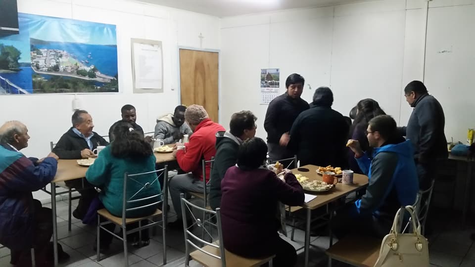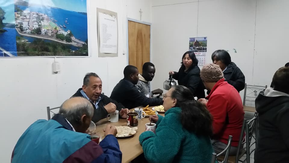 Una vez terminada la Eucaristía los presentes se reunieron en el comedor social para compartir un cafecito y conocer más nuestros nuevos “vecinos”. Se dio a conocer un poco de su historia, que emocionó a muchos, ya que realmente hace pensar y recordar la frase de San Alberto Hurtado ¿Qué haría Cristo en mi lugar? ¿Qué haría el Señor al ver la situación de tantos hermanos migrantes que están pasando hambre y frío en nuestras tierras chilotas?